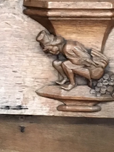 The monks had to sit in uncomfortable seats, whose undersides were carved with often profane images. Here a man defecates money. The seats were on hinges and when pulled down to be sat on, the images were invisible. They were meant to amuse.